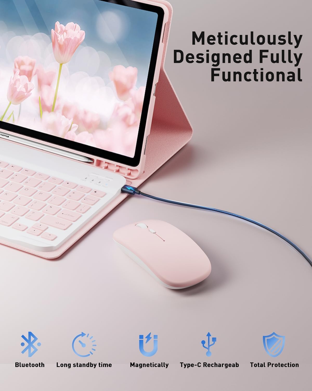 The included Bluetooth mouse adds another layer of convenience, especially for users who prefer precise cursor control. Navigating documents, editing text, or working with spreadsheets becomes much easier with a mouse, and its rechargeable design eliminates the need for disposable batteries. Together, the keyboard and mouse create a setup that feels remarkably close to a traditional laptop, while retaining the portability of a tablet.